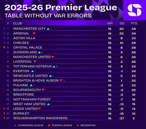 12月17日,數據機構Squawka統計了去掉有爭議的VAR判罰的英超積分榜。如果沒有VAR爭議判罰,曼城將會反超阿森納,上升到英超榜首的位置。