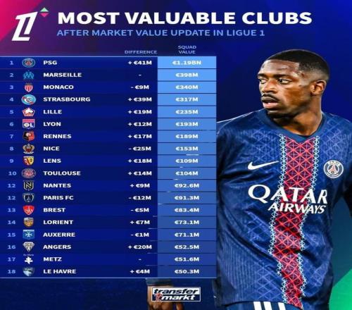 而另外的巴黎攻擊手包括杜埃、克瓦拉茨赫利亞和登貝萊的身價分別是9000萬到1億歐元,分列法甲的個人身價排行榜3到5位的。除了他們阿什拉夫·哈基米、努諾·門德斯、帕喬、巴爾科拉的身價為7000萬到8000萬,他們分列這6到10位的。也就是說整個法甲前10名有9名是巴黎隊員,由此可知,他們對這項賽事的統治的確是有根基的。