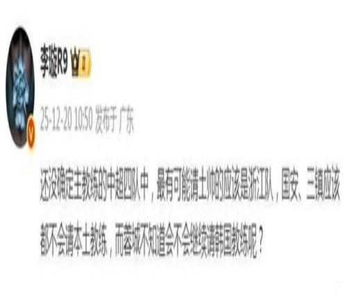 浙江隊(duì)也是一支奇葩的球隊(duì),送走合作多年的喬迪,請來卡內(nèi)達(dá)干了一年,分手。要請土帥了。12月20日,媒體人李璇微博透露:“還沒確定主教練的中超四隊(duì)中,最有可能請土帥的應(yīng)該是浙江隊(duì),北京國安、武漢三鎮(zhèn)應(yīng)該都不會請本土教練,而成都蓉城不知道會不會繼續(xù)請韓國教練呢?”