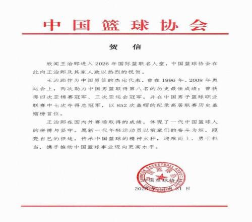 欣聞王治郅進入2026年國際籃聯名人堂,中國籃球協會在此向王治郅及其家人致以熱烈的祝賀。