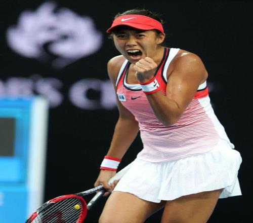 2016年1月19日,中國選手張帥在比賽中慶祝。當日,在墨爾本進行的2016年澳大利亞網球公開賽女單第一輪比賽中,中國選手張帥以2:0戰勝羅馬尼亞選手哈勒普,晉級第二輪。新華社記者 畢明明 攝