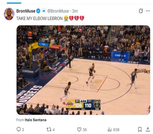 末節(jié),末節(jié)開場,詹姆斯2分3助攻,幫助湖人再度縮小到5分。海斯暴扣得手后已經(jīng)縮小到3分,隨后掘金又拉開,詹姆斯關(guān)鍵的上籃但落地左手撐了一下疑似受傷,隨后被換下。